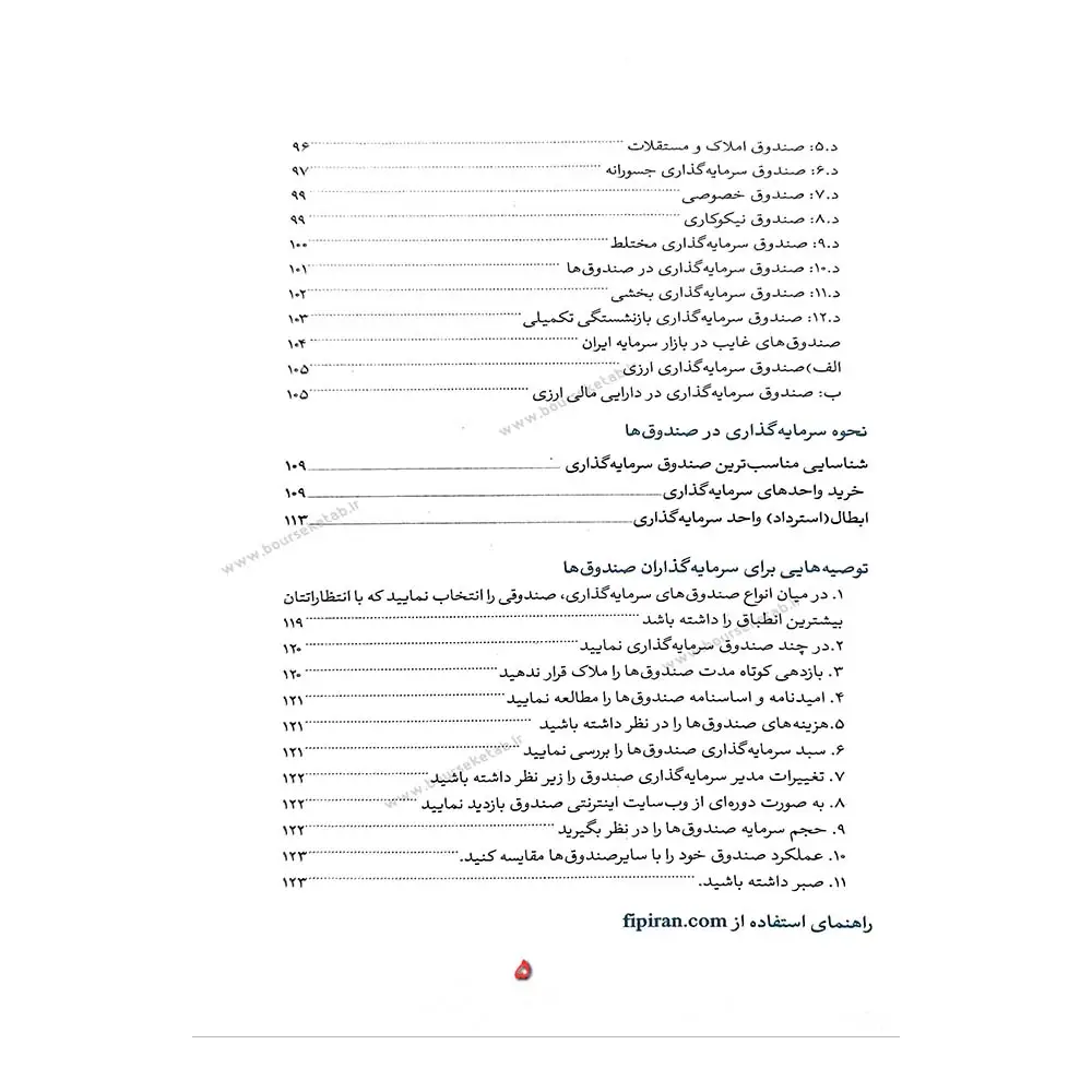 سرانجام در فصل پنجم توصیههایی برای سرمایهگذاری موفق در صندوقهای سرمایهگذاری تقدیم شده است.